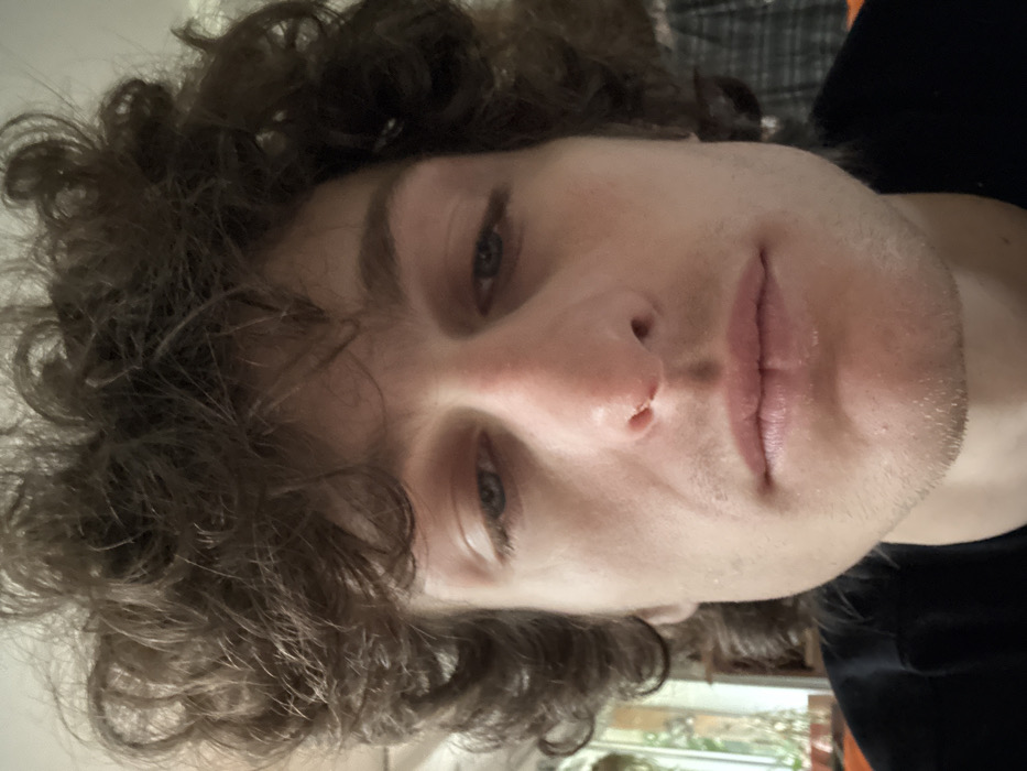 A close-up, frontal portrait captures a male subject indoors in Vincennes, France. The adult individual possesses fair skin, dense brown curly hair, and prominent eyebrows. His blue eyes are partially open, gazing slightly downwards, exhibiting minor redness in the lower eyelids. A small scab is visible on the bridge of the nose. The subject's mouth is closed, featuring full, pink-toned lips. Light stubble covers the chin and jawline. He wears a black crew-neck shirt. The background is blurred, revealing indistinct green foliage on the left and a vague plaid or checkered fabric pattern on the right. The scene is illuminated by soft, ambient light.