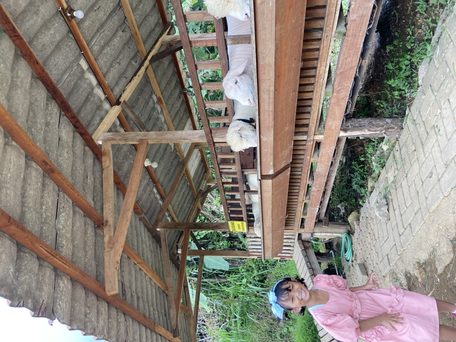 The image displays an outdoor animal enclosure in Selotapak, Indonesia, featuring a wooden structure with a corrugated gray roof supported by exposed wooden beams. In the foreground, a young girl wearing a light pink ruffled dress and a light blue bow in her hair stands on a paved pathway of rectangular bricks, smiling directly at the camera with her left hand slightly raised. To her right, several white-fleeced sheep are visible within the elevated wooden enclosure, with their heads extending above horizontal feeder troughs. One sheep on the left possesses a dark collar. A partially visible yellow sign with black text, reading "DILARANG," hangs on the left side of the wooden pen. Lush green vegetation forms the background behind the enclosure. A coiled green hose is present on the dirt ground beneath the pen, near a small wooden ramp. Two bare lightbulbs are affixed to the underside of the roof structure.
