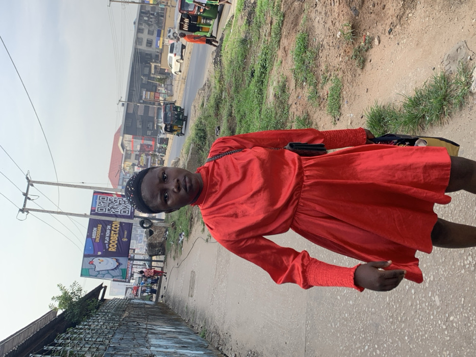 A young woman stands on a concrete sidewalk in Aba, Abia, Nigeria