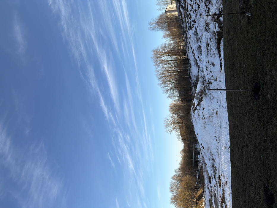 The image depicts an outdoor landscape in Valozhyn, Belarus, under a clear, bright blue sky with sparse, wispy cirrus clouds stretching horizontally. The foreground consists of dark, partially thawed ground covered in short, dark green-brown grass. Two thin, dark vertical stakes or sapling supports are visible in the foreground; one is centrally positioned in the lower-left, and another, less distinct, is on the right, with a small shovel leaning near its base. The midground features an undulating terrain covered in irregular patches of melting snow and exposed brown earth and vegetation. Beyond this, the background includes a dense line of bare deciduous trees with dark branches, illuminated from the left, extending across the width of the frame. In the central distance, behind the trees, a light-colored structure resembling a bridge or elevated pathway is visible. Further in the background, faint industrial structures are discernible above the treeline on the left. To the right, behind a snowy slope and trees, several multi-story residential buildings with light-colored facades are visible. No individuals or active subjects are present. The scene is illuminated by natural sunlight, indicative of a clear day.