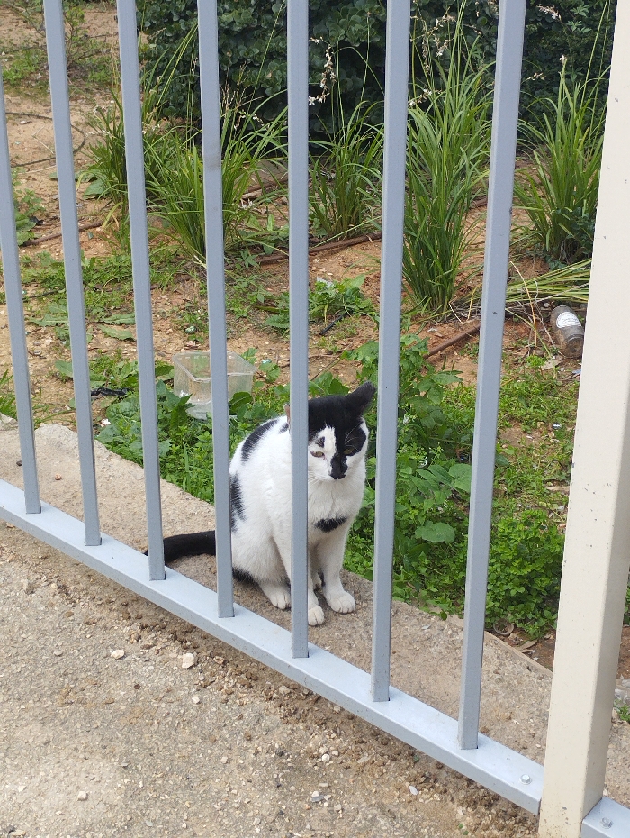 - "An outdoor scene in Petah Tikva, Israel, depicts a bicolored domestic cat positioned behind a light grey metal fence" by FM-pIDc62, licensed under CC BY 4.0