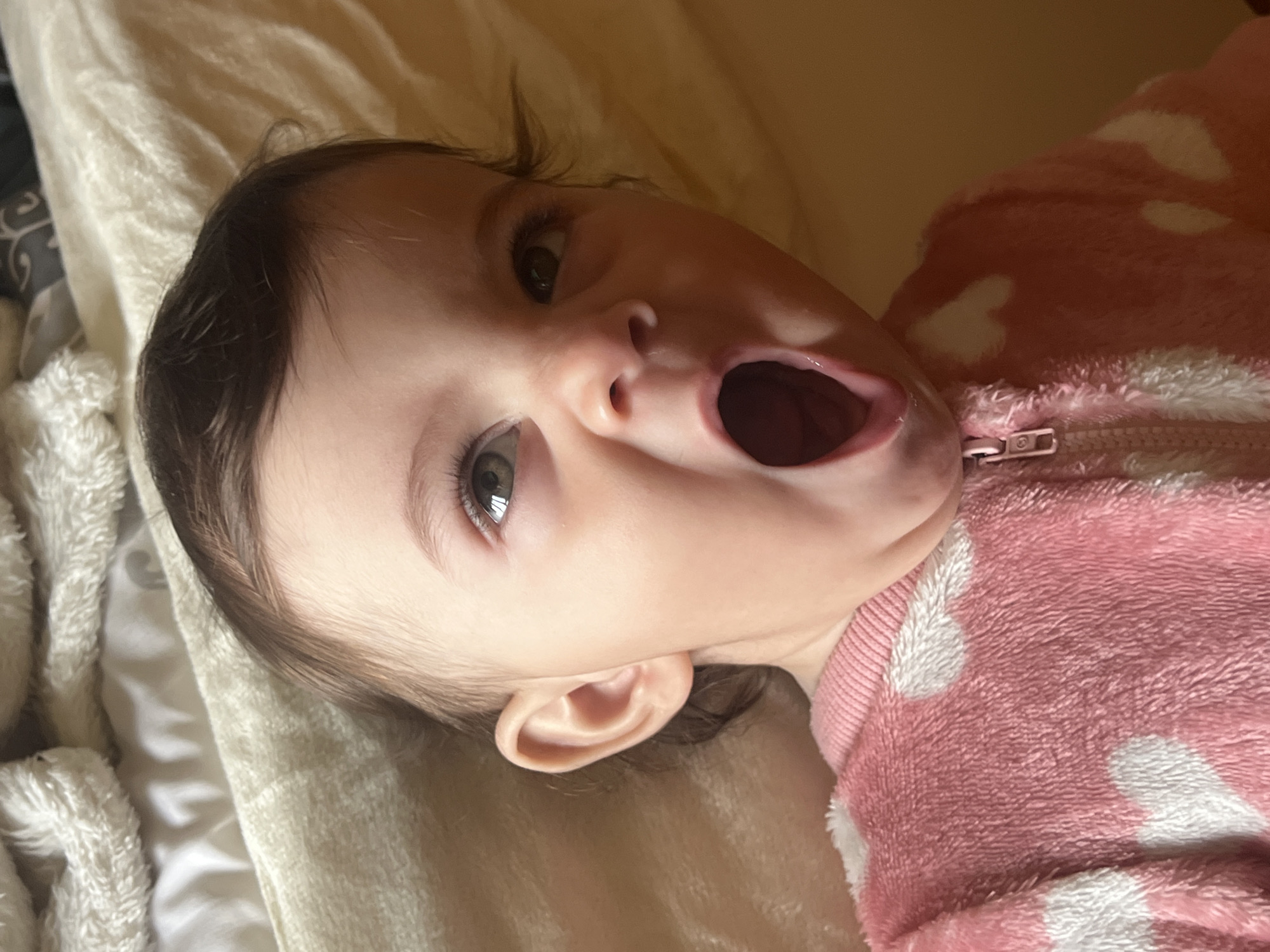 A baby with dark hair and light eyes is lying on a light-colored blanket. The baby is wearing a pink and white heart-patterned zippered outfit and has their mouth open wide. The baby is not in Elena, Bulgaria.