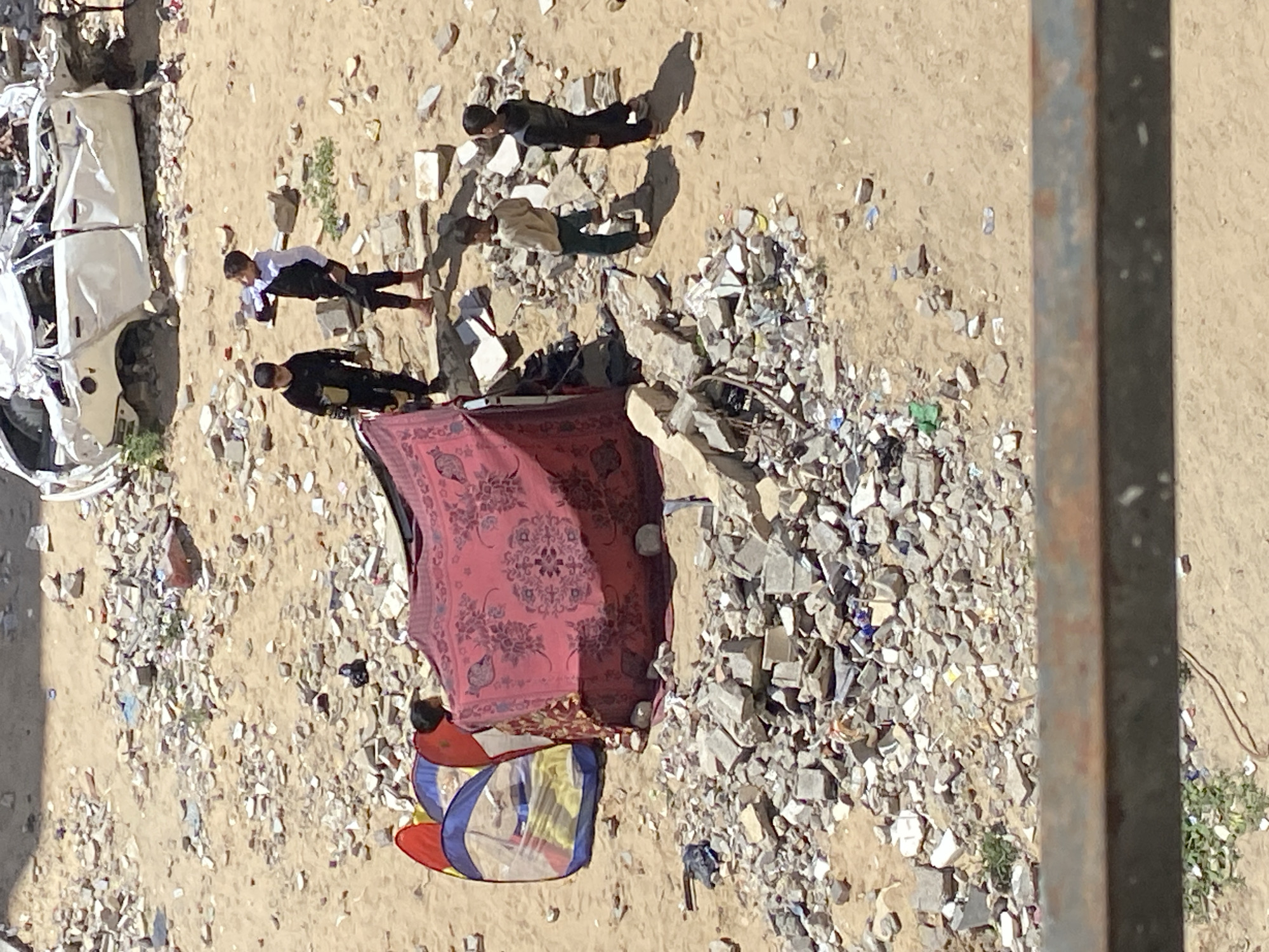 The image depicts a scene in Khan Yunis, Palestinian Territory, characterized by debris and apparent destruction. A damaged white vehicle sits to the left of the frame. Several people are present, some standing, some lying on the ground near a rug and a blue and yellow object. The ground is covered in rubble and debris. A metal structure appears on the right side of the frame.