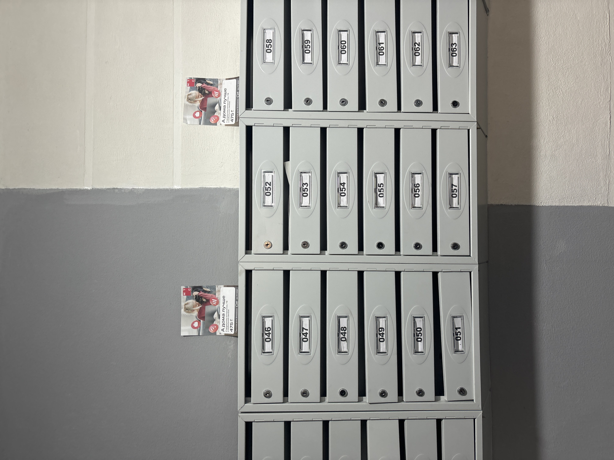 An interior view displays three vertical columns of gray metal mailboxes mounted on a two-toned wall, likely within a common area of a residential building in Krasnodar, Russia. The wall above the mailboxes is bisected vertically, with the left section painted medium gray and the right section off-white. Below the mailboxes, the wall continues the two-tone scheme with a darker gray on the left and textured off-white on the right. The mailboxes are numbered sequentially from 046 to 063. The leftmost column contains mailboxes 046 through 051. The middle column contains mailboxes 052 through 057. The rightmost column contains mailboxes 058 through 063. Each mailbox features a keyhole; keys are inserted into mailboxes 052 and 058. A white piece of paper or mail protrudes from mailbox 053, and mailbox 051 appears slightly ajar. Two identical printed advertisements are affixed to the wall above the mailboxes. Each advertisement displays a blonde woman with a black dog using a laptop, with "MTC" branding in the upper right corner. Russian text reads "А дома лучше" ("It's better at home"), indicating a service including home internet, TV, and mobile communication, priced at 475 ₽.