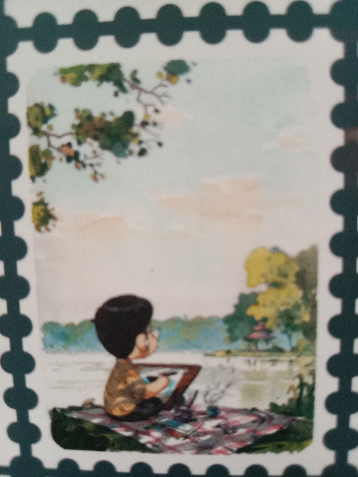 The image is a watercolor painting of a young person sitting on a blanket by a lake, painting. They are facing to the right of the frame, and they are wearing a yellow shirt. There is a small, dark, wooden easel and a brush and a small container of paint in front of them. There are two trees in the distance. The painting is surrounded by a dark green frame with a scalloped pattern. The painting is depicting a scene in Tachileik, Myanmar. The coordinates 20.45, 99.895 place the location in Tachileik, Myanmar.