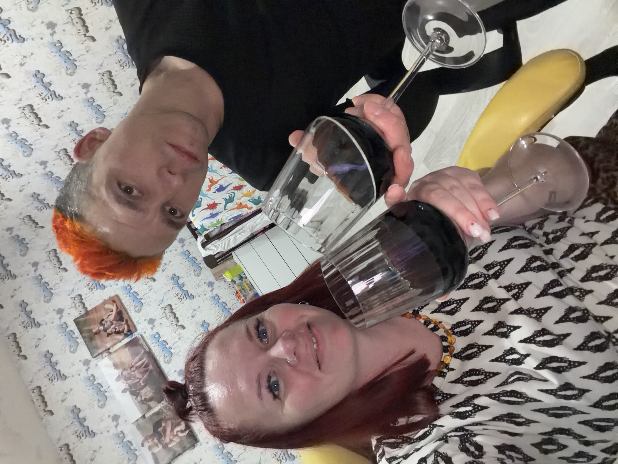 Two people are posing for a selfie indoors, each holding a wine glass filled with red wine. One person has short grey hair with orange dyed at the front, wearing a black shirt, and holding a wine glass with a stem. The other person has shoulder-length auburn hair pulled back, wearing a patterned black-and-white shirt, and holding a similar wine glass. The photo is taken at an angle. The location could be in Chaikovsky, Russia. In the background, there is a wall with a blue and white pattern, some pictures hanging, a white cabinet with colorful items, and a dinosaur-patterned blanket. A yellow object is also visible.