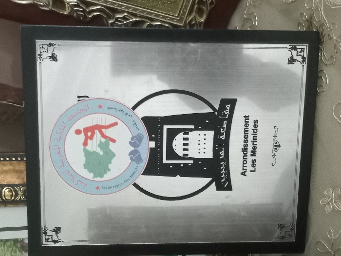 A rectangular plaque, framed in black, displays a reflective silvery surface. At the top, a circular emblem features the Arabic text "الجامعة الملكية المغربية للملاكمة" (The Royal Moroccan Boxing Federation) and "عصبة جهة فاس - مكناس" (Fez-Meknes Regional League), along with the English "Ligue Région Fès-Meknès". This emblem includes a green map of the Fez-Meknes region, a red stylized boxer, and two blue boxing gloves. Below this, a large black outline depicts a Moroccan architectural gate or fortified structure. Beneath this outline, the Arabic text "مقاطعة المرينيين" is presented, followed by the English "Arrondissement Les Merinides," identifying a specific administrative district within the city of Meknes, Morocco. Decorative scrollwork accents the corners of the plaque and appears as a small horizontal element above the English district name. The plaque is positioned on a light-colored, patterned fabric surface, with blurred background elements suggesting additional decorative objects.