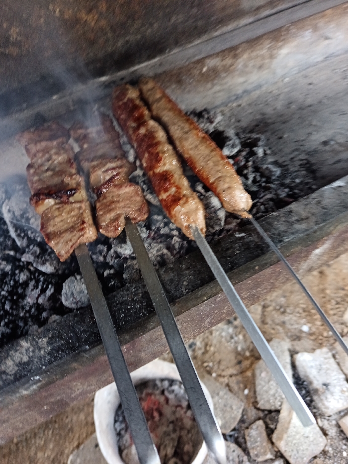 - "three skewers of grilled meat cooking over charcoal" by FM-a8p7q1, licensed under CC BY 4.0