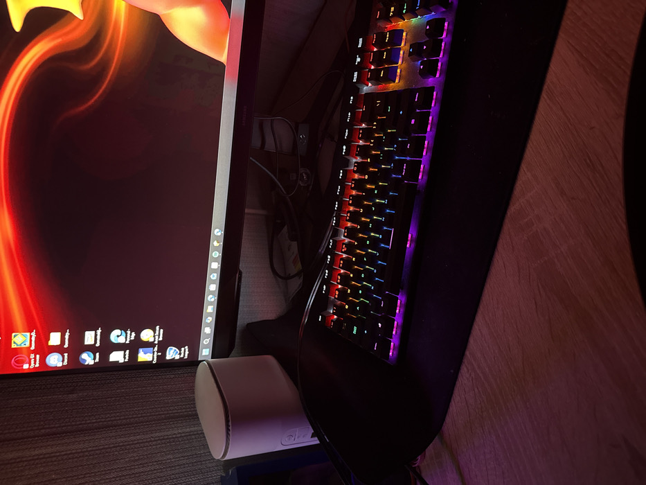The image displays a dimly lit computer workstation located in Dimitrovgrad, Bulgaria. A dark-framed computer monitor occupies the central upper portion, exhibiting a desktop environment with a fiery red and orange abstract background, possibly depicting a human arm. Visible application icons on the left side of the screen include Opera GX Browser, Discord, Geometry Dash, Steam, GameLoop, Fortnite, Microsoft Edge, Chrome, Steam Browser, and Roblox. Below the monitor, a full-size mechanical keyboard with active multi-color (rainbow) RGB backlighting is positioned on a black mouse pad. To the left of the monitor, a white, vertically oriented, rounded rectangular electronic device is present. The workstation rests on a light-colored wooden desk surface, displaying visible grain patterns. Multiple dark cables are discernible behind the keyboard and monitor. The background behind the white device and to the left of the monitor appears as a dark, textured surface, possibly a wall or curtain. No individuals, actions, or interactions are present in the scene.