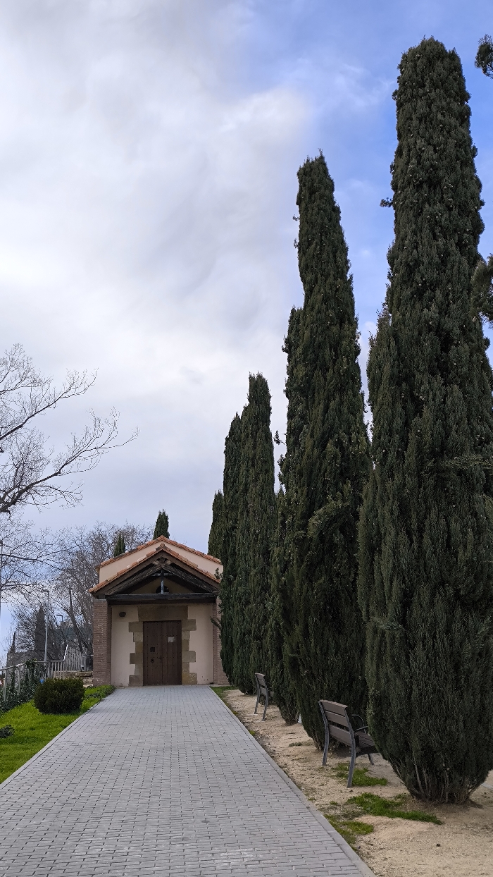 A stone path leads to a small building with a brown roof and wooden doors. The building is flanked by a row of tall, dark green cypress trees. Benches sit between the trees and the path. To the left of the path is a small patch of green grass and a bare tree. The sky is overcast with patches of blue.