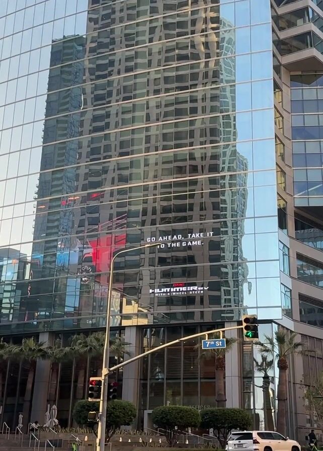 street corner with tall buildings in the background. The buildings are modern, mostly made of glass, and reflect the surrounding city. In the reflection, there's an ad for Hummer that reads "GO AHEAD. TAKE IT TO THE GAME". There are street signs indicating 7th Street and Figueroa Street. Pedestrians and cars can be seen crossing the intersection, with traffic lights visible. The sky is clear and blue. Overall, it's a typical city scene with a focus on the architecture and the street-level activity.