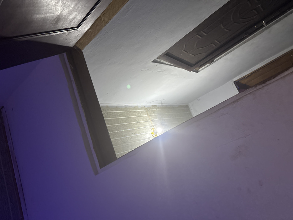 An angled view looks upward at an interior space. A white ceiling has a decorative access panel and a rectangular wooden element. A wall painted in shades of purple and white angles upward. Another wall shows horizontal planks. A light bulb hangs from the ceiling, casting a bright glow. The overall aesthetic is simple and utilitarian.