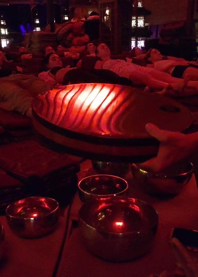 In a dimly lit indoor setting, a person holds a tambourine in front of a table holding four metal bowls of varying sizes and a cell phone