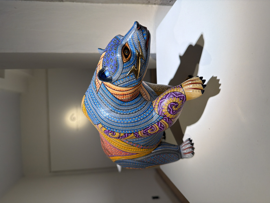 A vibrant, hand-painted wooden bear statue is positioned in a corner. Its body is adorned with intricate patterns in shades of blue, gold, purple, and orange. The head features golden accents, with detailed eyes and ears. The statue's shadow is cast on the white wall, creating a distinct contrast. The surrounding environment includes sections of a bright, white wall and a dimly lit ceiling, emphasizing the bear's colorful presence in the space.