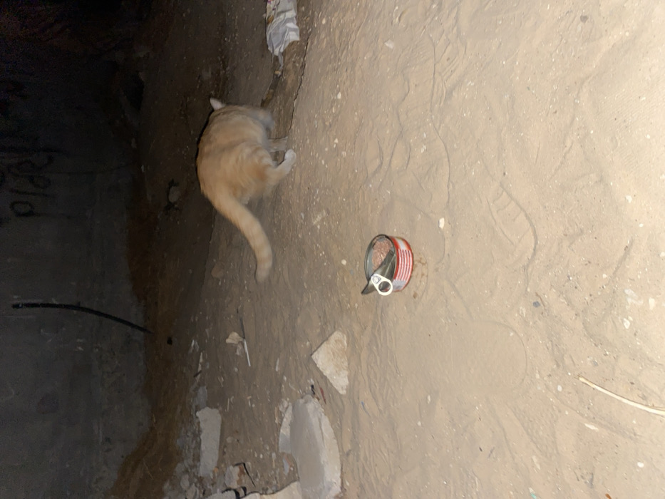 This image depicts an outdoor scene at night in the city of Khan Yunis, Palestinian Territory. The ground consists of light-colored sand or dirt, scattered with various debris including fragments of concrete, small stones, and what appears to be discarded fabric. In the foreground, an open, cylindrical metal can is visible, featuring red and white horizontal stripes reminiscent of the lower portion of the American flag. The can contains dark, wet food, and its lid is partially peeled back. A light orange/tan cat is positioned in the mid-ground, facing away from the viewer and moving towards the right side of the frame. Its head is lowered, and its tail is slightly raised. The background is dark and features a rough, textured wall or structure with faint, dark graffiti partially visible, reading "pl..." A dark, thin pipe or cable extends vertically downwards along this wall. The scene is illuminated by a localized, dim artificial light source, casting soft shadows.