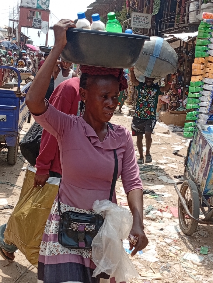 In a crowded marketplace, a woman carries a large basin of assorted bottled drinks on her head. She wears a purple blouse, a patterned skirt, and a small black purse. In the background, a man bears a heavy sack. Other carts, pedestrians, and piles of merchandise fill the bustling scene. A sign that reads, "Welcome to GOD IS ABLE (GFM & FM) not to herbalist tobacco" is visible above the crowd.