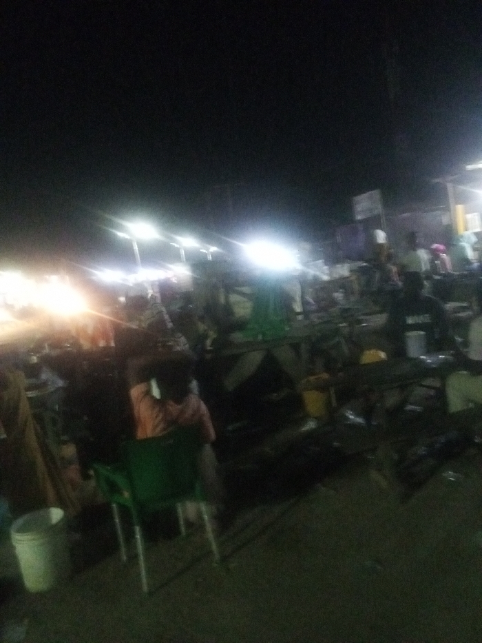 A bustling outdoor market is captured at night. The scene is illuminated by bright overhead lights, creating a somewhat hazy atmosphere. People mill about stalls, some sitting on chairs and engaging in conversations. The foreground features a green plastic chair and a white bucket, while various tables and objects are scattered throughout. A sign is visible in the background, adding to the sense of a vibrant, crowded marketplace at night.