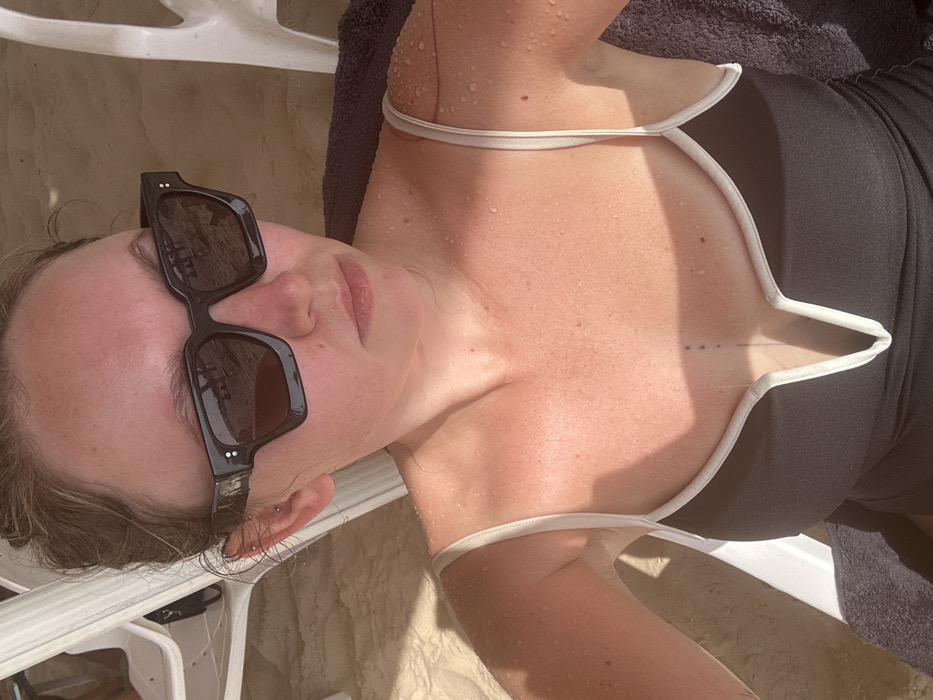 A female individual is depicted in a close-up, chest-up shot, reclining in a white plastic beach chair on a sandy beach in Tel Aviv, Israel. She wears a black swimsuit with white trim along the V-neckline and straps. Large, dark rectangular sunglasses, featuring two small white dots on each temple, obscure her eyes and reflect a body of water with distant shore details. Her skin, particularly on her chest, shoulders, and forehead, exhibits reddening consistent with sun exposure, and is covered in numerous small water droplets, indicating recent immersion or exposure to water. A small, delicate tattoo comprising a vertical line with five small dots is visible on her sternum, below the swimsuit's neckline. Her hair is pulled back, and two small stud piercings are visible on the helix of her left ear. A dark blue or black towel is draped over the armrest of the chair to her right. The background primarily consists of light-colored beach sand, illuminated by bright sunlight.