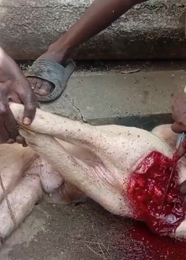three men butchering an animal outdoors. The animal, which appears to be a pig, is lying on its side on a concrete surface. Its legs are tied together. One of the men is using a knife to cut into the animal's abdomen, and blood is visible. The other two men are holding the animal in place. The men are wearing sandals and have dark skin. The background is blurry, but it appears to be a grassy area with some concrete steps.