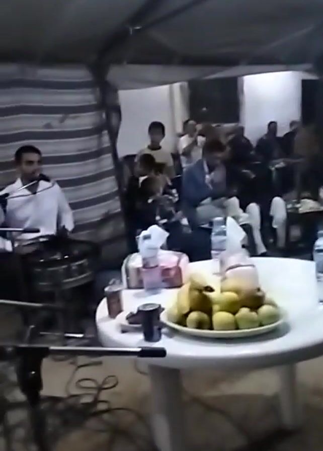 group of men performing music inside a tent-like structure. The musicians are positioned behind microphones, and one plays the drums. A table in the foreground holds a plate of fruit and bottled water. The camera pans around the room, capturing the musicians and the audience seated in the background. The environment appears informal, possibly a celebration or gathering.