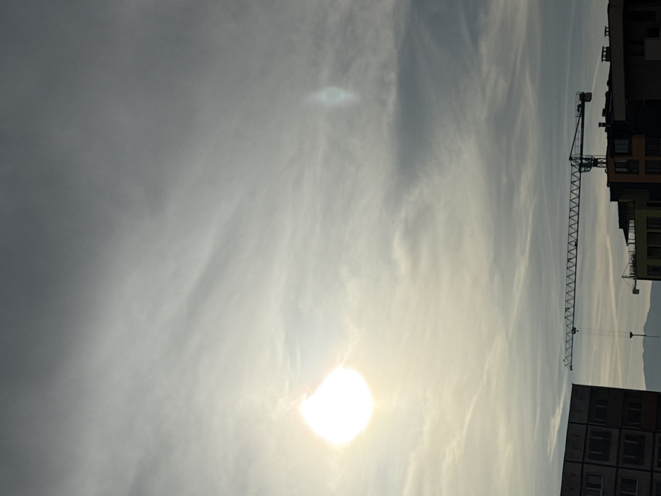 The image presents an urban skyline in Sofia, Bulgaria, under a bright, cloudy sky, with evidence of ongoing construction and distant mountains. The upper two-thirds of the frame are occupied by a light grey, overcast sky filled with diffuse cirrus and stratocumulus clouds. The sun, a brilliant white, overexposed orb, is prominently positioned in the upper-left quadrant, creating a noticeable lens flare. A secondary, fainter cyan-colored lens flare is visible in the upper-right. The lower third of the image reveals a horizontal panorama of structures. On the left, a portion of an older, multi-story building with a utilitarian grey facade and dark windows is visible. Stretching across the mid-ground, a blue lattice boom tower crane is silhouetted, with a cable and attachment hanging vertically from its boom, indicating active construction. Beneath the crane, a series of modern residential buildings with varied rooflines and facades in tones of orange, yellow, and dark brown are present. In the far distance, a hazy outline of mountains, consistent with the Vitosha mountain range, is visible on the horizon. No individuals are visible within the scene.