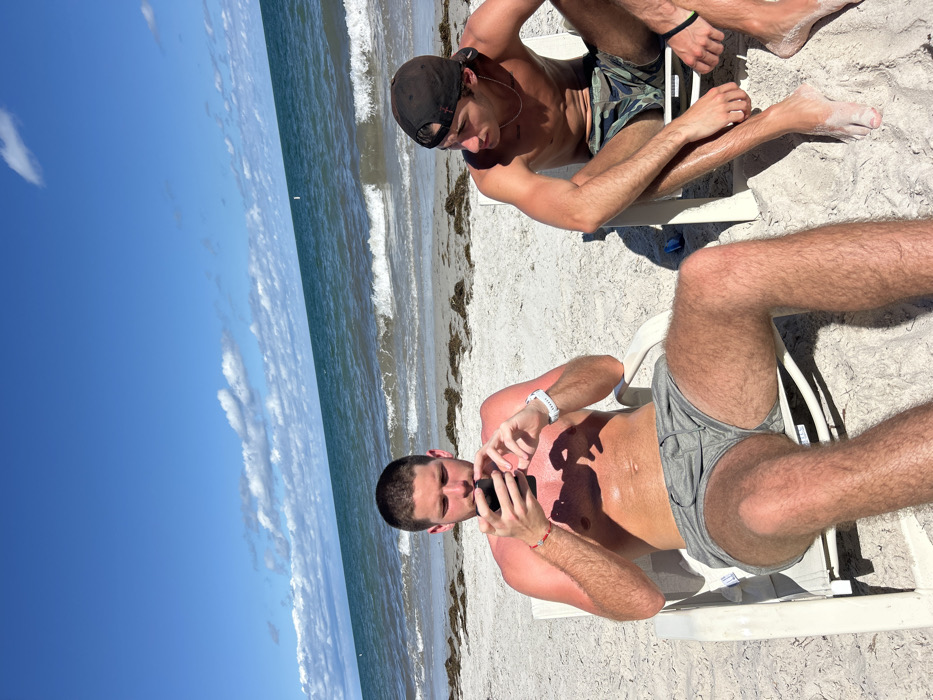 - "Two shirtless adult males are depicted seated in white plastic beach chairs on a sunlit sandy beach in Key Biscayne, United States" by FM-PP8Yw1, licensed under CC BY 4.0