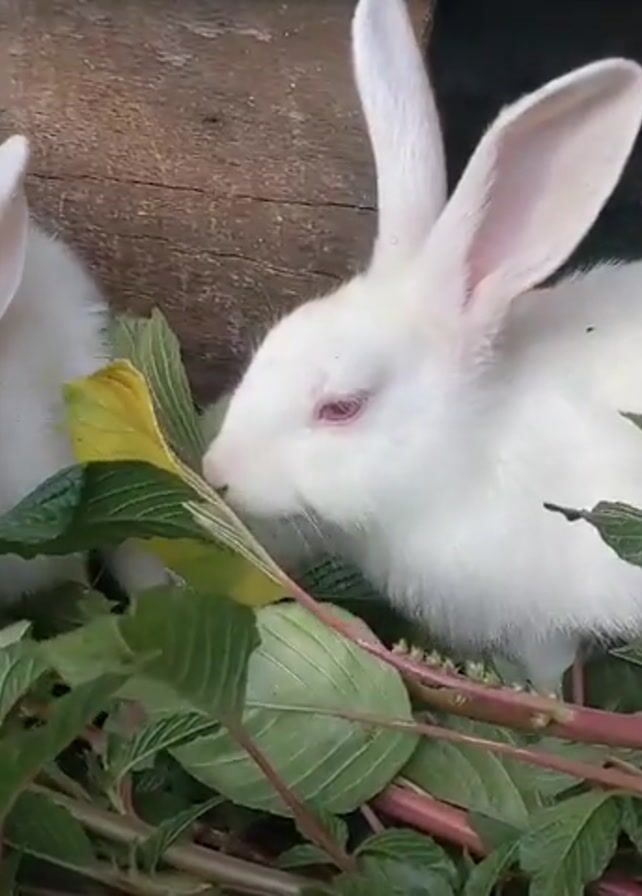 - "Two white rabbits with pink eyes are eating green leaves in a wooden enclosure" by FM-QrecA3, licensed under CC BY 4.0
