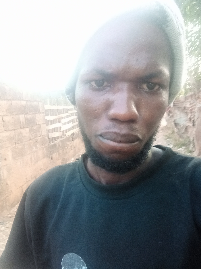 A man with dark skin and a black beard wears a grey beanie and a black t-shirt with a light grey design. He looks directly at the camera. A brick wall with metal bars is visible in the background, along with foliage. The lighting is bright, particularly near the top left corner, slightly obscuring the view.