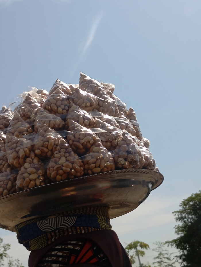 In Numan, Nigeria, an individual is captured from a low-angle perspective, carrying a large, metallic, round tray balanced on their head. The tray is densely packed with numerous small, clear plastic bags, each containing clusters of light brown, rounded items consistent with groundnuts or similar confectionery. The contents are piled high, forming a central peak. The person's head is adorned with a blue, black, and yellow patterned headwrap or padding beneath the tray, with dark brown fabric visible below. The background features a bright blue sky with a faint white contrail in the upper left, and sparse green foliage is visible in the lower right, indicative of an outdoor, sunlit environment.