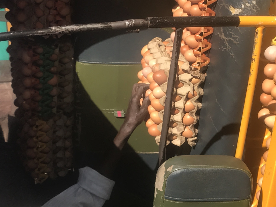 The image displays a close-up interior view within a vehicle in Jos, Nigeria, dominated by a large quantity of eggs