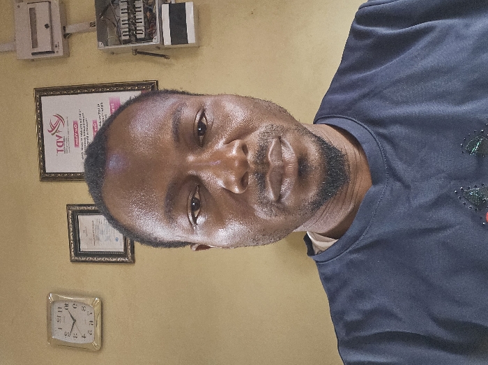 This image captures a close-up of an adult male in an indoor setting within the city of Sabon Tasha, Nigeria