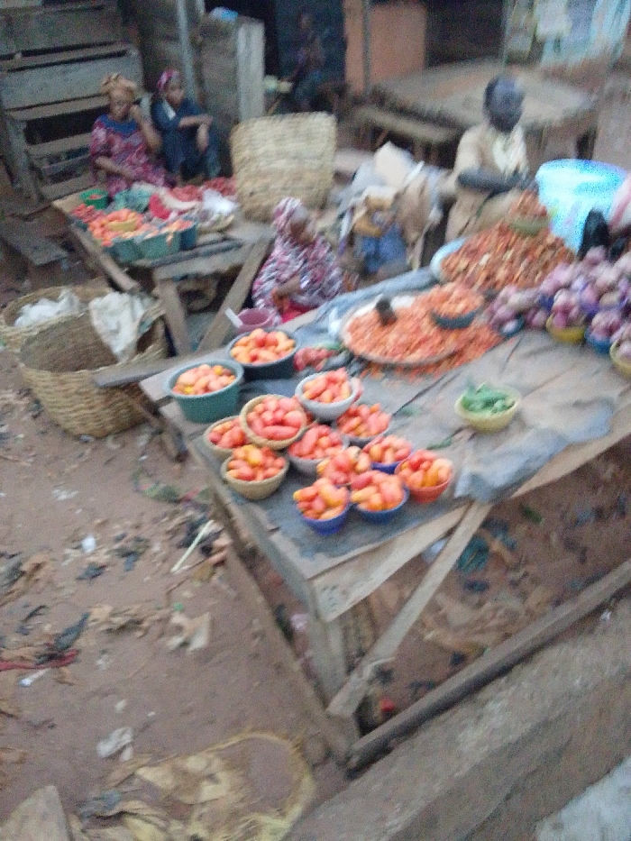 A bustling outdoor market features vendors selling various produce. One table showcases numerous small bowls filled with reddish-orange tomatoes. Other offerings include heaps of dried red peppers, onions, and green vegetables. Woven baskets are present, along with wooden tables displaying goods. Several people are seated behind the tables, seemingly tending to their stalls. The ground appears uneven and scattered with debris.