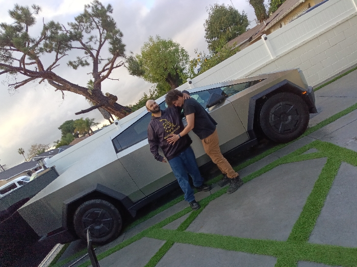 Two men stand by a silver Tesla Cybertruck parked on a driveway with artificial grass lines. One man, bald with a beard, wears a patterned hoodie and jeans. The other man wears a dark t-shirt and khaki pants, with his arm around the first man. The Cybertruck is partially visible, showcasing its angular design. A large tree overhangs the scene on the left, while a white fence stretches along the background. A house is partially visible behind the fence.
