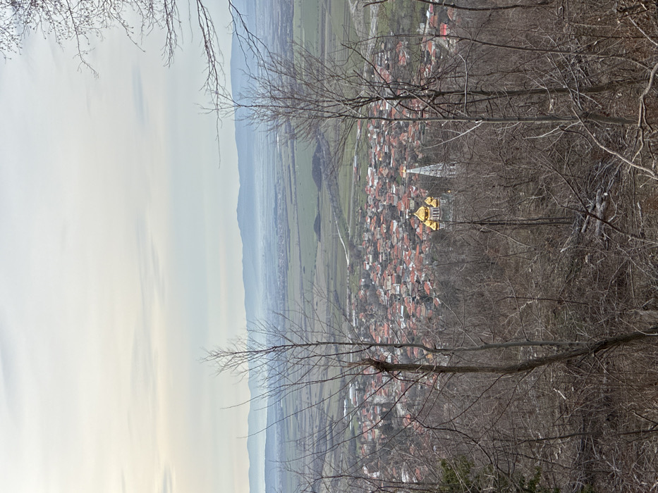 This image presents an elevated, panoramic view overlooking the town of Shipka, Bulgaria, likely captured from a hillside or mountain slope. The immediate foreground features a dense scattering of leafless, deciduous trees and undergrowth, indicative of late autumn or winter. Some cut logs and branches are visible on the forest floor, suggesting recent clearing or natural debris. Below the foreground trees, the town of Shipka unfolds, characterized by a concentration of buildings with predominantly red-tiled roofs. Prominently situated within the townscape is the Shipka Memorial Church, also known as the Nativity of Christ Church or Shipka Monastery. This structure is distinguished by multiple golden, onion-shaped domes and tall, slender white spires, standing out against the surrounding urban fabric. The church is partially framed and slightly obscured by the bare branches of the foreground trees. Beyond the town, a vast valley extends into the distance, comprising cultivated fields and scattered patches of vegetation. Faint roadways or paths can be discerned crisscrossing the landscape. The horizon is defined by a hazy range of mountains or hills. The sky above is overcast, presenting a diffused, light grey tone, contributing to an overall muted light quality. No discernible people, specific actions, or interactions are visible within the frame.
