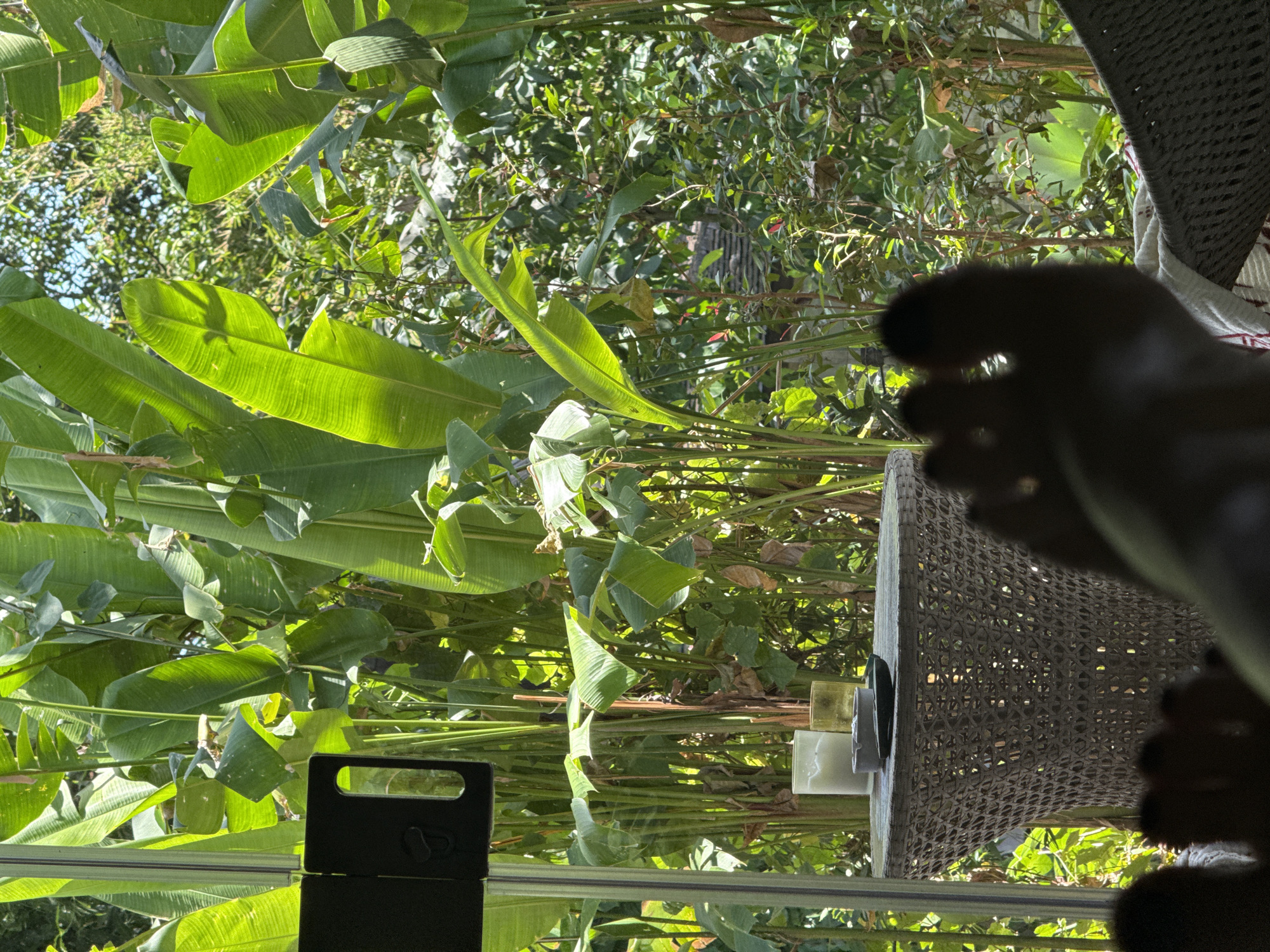 A daytime interior scene from a location possibly in North Kuta, Indonesia, is viewed through a window. Lush green foliage dominates the background, including banana plants and other tropical vegetation. Reflections on the glass of the window show elements within the interior, including a dark, rectangular object, possibly a suitcase or bag, and two cylindrical objects, possibly candles. Part of a woven texture, likely a chair or other furniture, and a blurry hand are visible in the foreground.