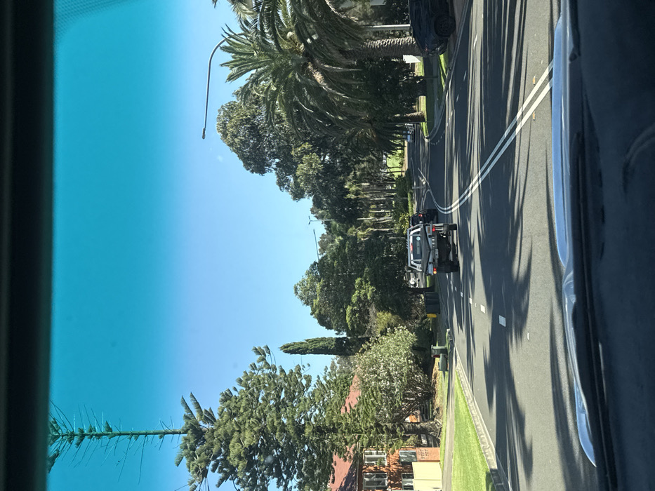 The image depicts a street scene viewed from inside a car. The road is lined with trees, casting shadows on the asphalt. A silver truck is driving ahead on the road. Buildings are partially visible on the side of the street. The sky is clear and blue, visible through the car's tinted windshield. There are double white lines on the road.