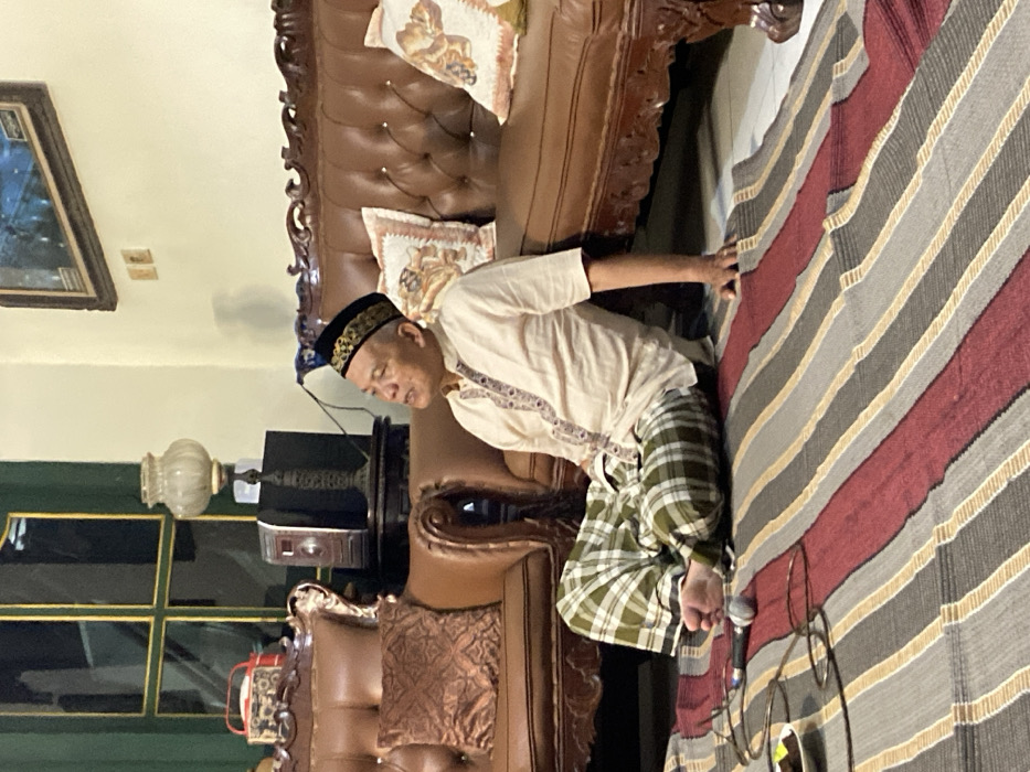 An adult male is seated on a striped floor mat in an indoor setting, identified as Mojokerto, Indonesia