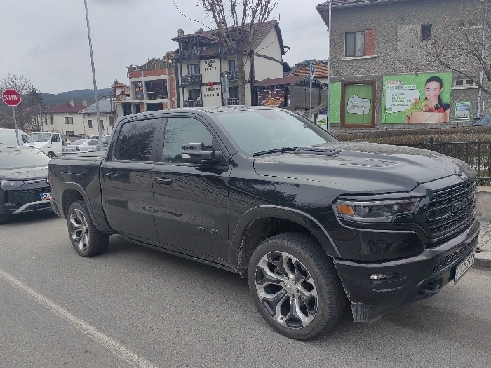 A black four-door Ram 1500 pickup truck, bearing Bulgarian license plate P7962HZ, is parked on the right side of an asphalt road in Dobrinishte, Bulgaria