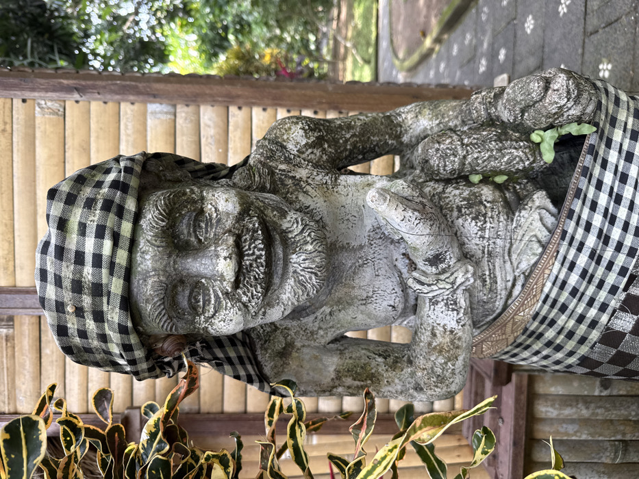 A stone statue, likely depicting a male figure, rests outdoors. The figure wears a checkered head covering and a matching cloth draped around its body. Moss or small plants grow from the statue's hand. The background features a light-colored bamboo fence. Colorful, pointed leaves of plants are visible at the bottom of the frame. The statue is aged and appears weathered.