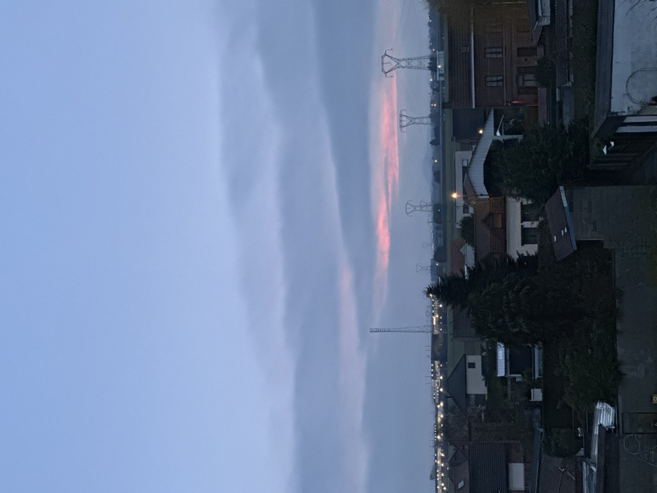 A horizontal view shows a town against a sunset sky. Power lines are silhouetted against the pink-tinged clouds. Buildings are clustered, with trees adding to the density. The left side is filled with the cool blue of the sky, contrasting with the warm glow near the horizon. Streetlights line the right, marking the edges of the town.