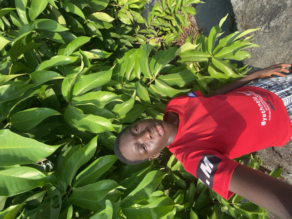 A young individual with dark skin and short, dark hair is depicted in a close-up, facing the camera directly with a neutral expression. The subject wears a red short-sleeved t-shirt featuring a black and white graphic with "LM" on the left sleeve and partially visible blue and white text "M" on the right chest. White text reading "Syethtnic IMITATIONAL MATEL ATELIER DOEUR & TROP" is printed on the shirt's front. Black and white plaid shorts are worn on the lower body. The background is composed of dense, vibrant green foliage with broad, glossy leaves, indicating a bush or shrubbery. A grey, textured surface, consistent with concrete, is visible in the lower right portion of the frame. The scene is brightly illuminated by direct sunlight. The individual is holding the camera, indicating a self-portrait. The specific location within the city of Ado, Nigeria, cannot be determined from the visual evidence present in the image.
