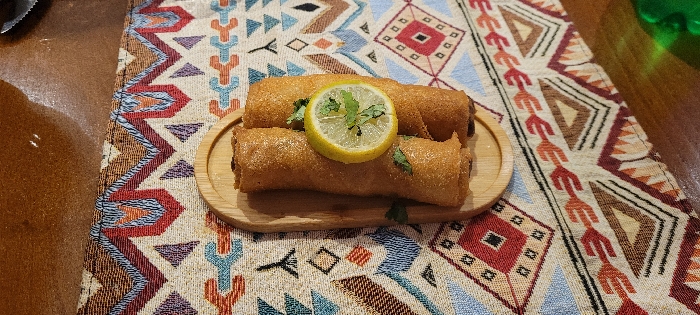 Two golden-brown, crispy rolls are arranged on a small, oval wooden serving board. A lemon slice sits atop the lower roll. Green sprigs of cilantro are tucked around the base and between the rolls. The board rests on a colorful table runner with geometric patterns in beige, brown, red, blue, and orange. The surrounding table surface is a warm brown.