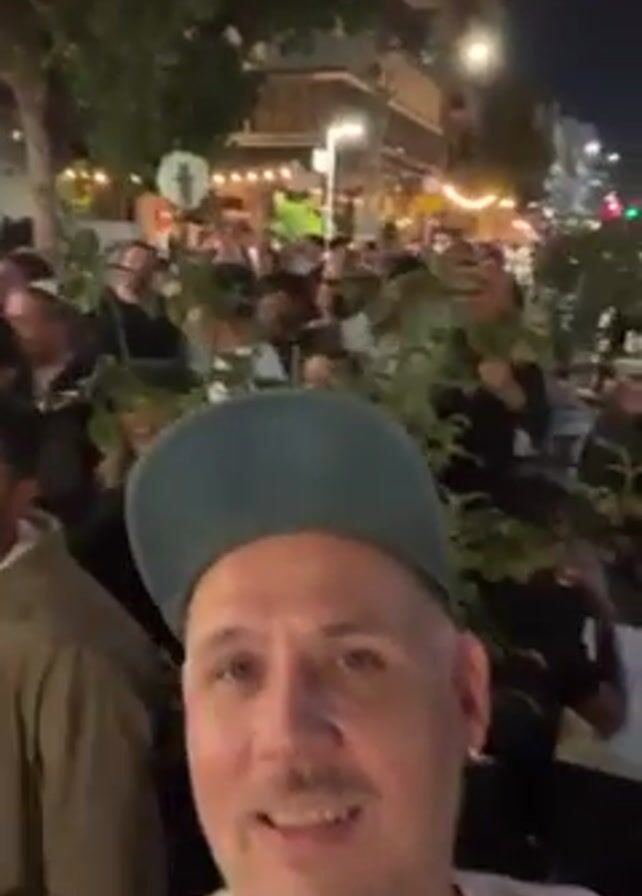 A man wearing a light blue baseball cap films himself amidst a crowd of people outdoors at night. The crowd seems to be celebrating, with many people holding up leafy branches. Buildings and streetlights are visible in the background, indicating an urban setting. The man smiles at the camera as he films the festive scene.