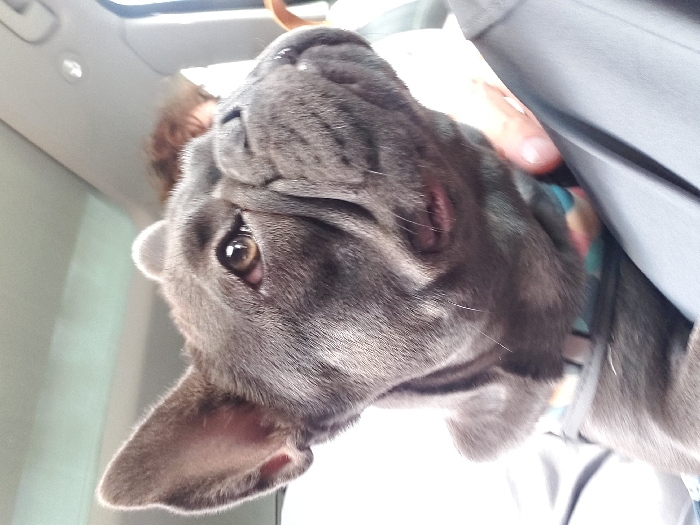 A close-up, slightly tilted shot features a gray French Bulldog. The dog is wearing a collar and appears to be inside a car, visible through the sunroof. A hand is resting on the dog. The dog's face is the primary focus. It has large eyes, a flat nose, and perked ears. The gray fur appears soft. The background consists of the car's interior.