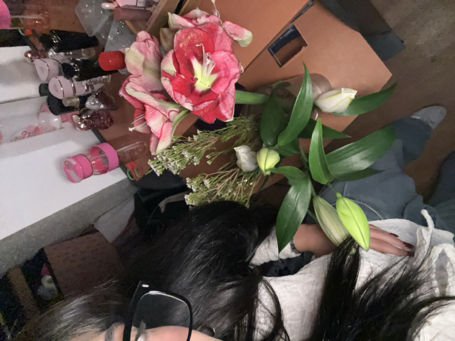 A person with dark hair, wearing glasses, is shown in a selfie. A bouquet of red and white flowers, with lilies, sits beside them. The background is cluttered with perfume bottles, a cardboard box, and clothing. The person wears denim pants and a white shirt.