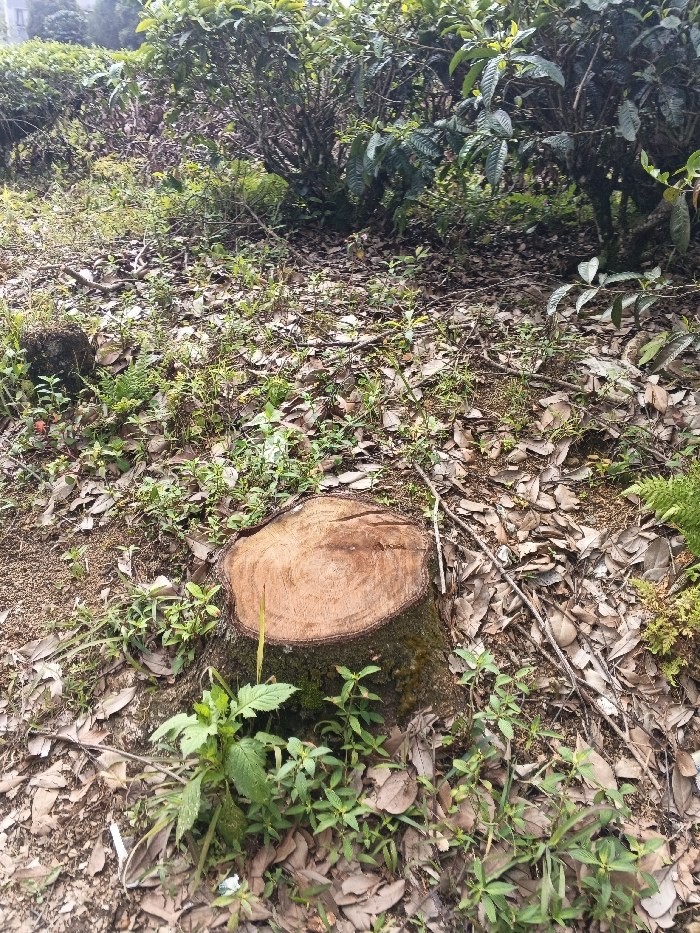 A tree stump dominates the foreground amidst fallen leaves, small plants, and twigs. The stump's cut surface reveals concentric growth rings. Lush greenery, including bushes and ferns, fills the background. The scene suggests a natural, possibly wooded or overgrown area.