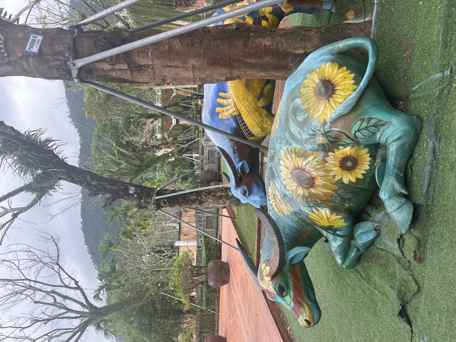 The image depicts an outdoor garden or park setting at Núi Thần Tài Hot Spring Park in Hòa Phú, Hòa Vang District, Đà Nẵng, Vietnam, under an overcast sky. In the foreground and mid-ground, two large, recumbent water buffalo statues are positioned on green artificial turf. The prominent foreground statue is teal green with numerous yellow sunflower motifs and green leaves painted across its body. It faces left, displaying visible horns, eyes, nose, and tail. Cracks and paint wear are discernible on its surface, particularly on the legs and back. Partially obscured behind it and a tree trunk, a second buffalo statue is visible, colored predominantly blue with yellow patterns, including what appears to be hands holding a corn cob. Several mature trees with varying foliage are present. The two trees framing the right side are supported by metallic tripod bracing structures. The rightmost tree displays a blue sign with white text, reading "PHƯƠNG VỸ" (Phuong Vy) and "A. S. M.". Another tree in the mid-ground exhibits epiphytic fern-like plants on its trunk. The background features a landscape of lush green mountains under a grey, cloudy sky. The ground transitions from the artificial turf to a reddish-brown tiled pathway or patio area on the left. Large, brown ceramic pots containing small shrubs are placed along the pathway and in the garden. A low concrete or stone wall with balusters runs horizontally across the mid-ground, delineating further garden areas with additional trees and tropical foliage, including palm trees. No people are visible in the scene.