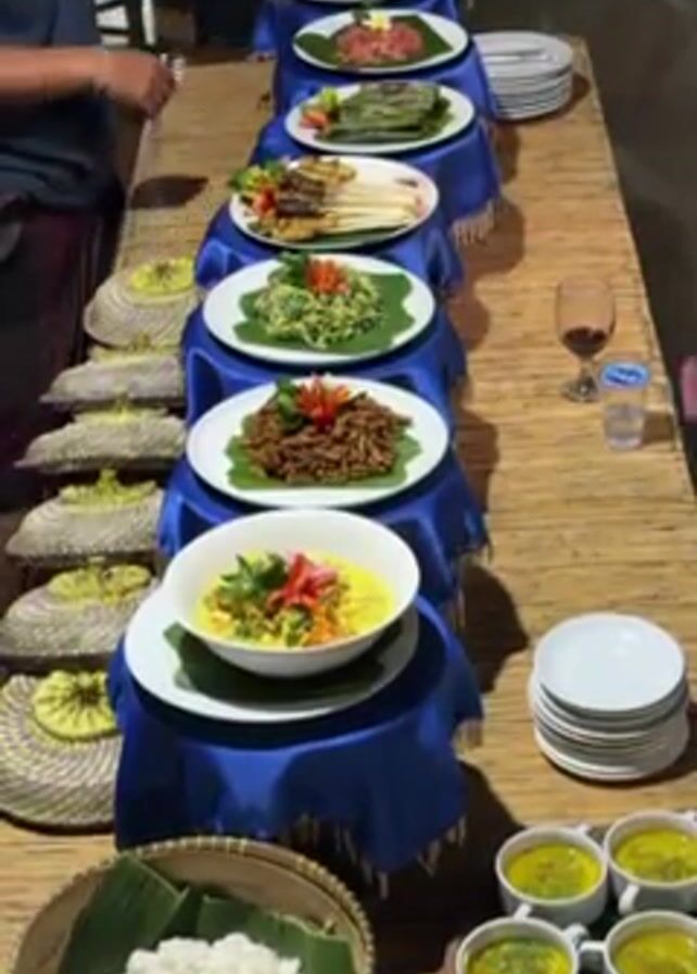 Here is a detailed description of the video: The video showcases a buffet-style setup on a long, woven bamboo table