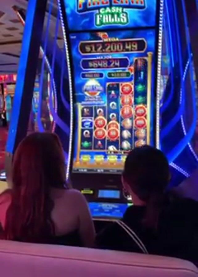 Two women are seated in front of an "Ultimate Fire Link Cash Falls" slot machine in what appears to be a casino