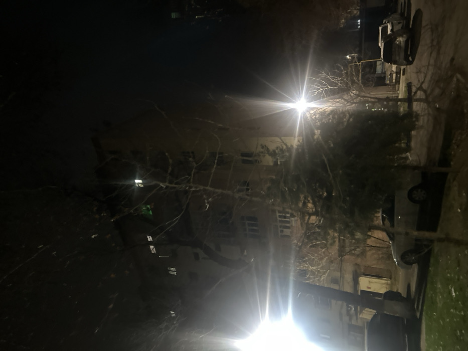 A night scene depicts a building illuminated by streetlights, partially obscured by a tree. Cars are parked alongside the building. The image is dark, with light flares from the streetlights dominating the view. The building is multistory, and windows can be seen. The sky is a uniform black, with the streetlights acting as the main light source.